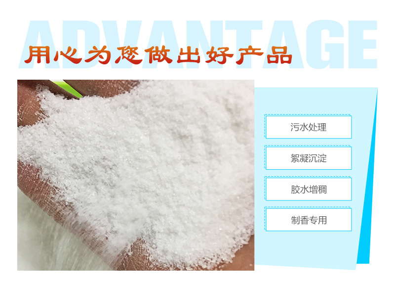 2、 添加少量非離子聚丙烯酰胺,即可受到很大的絮凝效果。一般只需添加0.01~10ppm(0.01~10g/m3),即可充分發揮作用。
